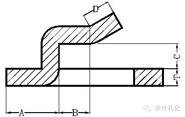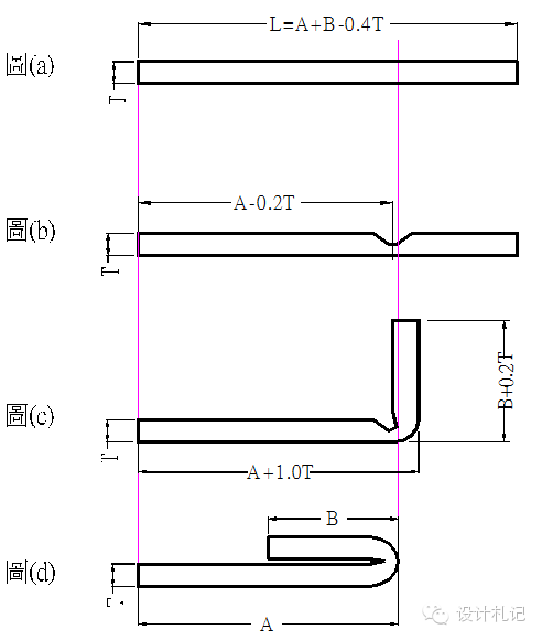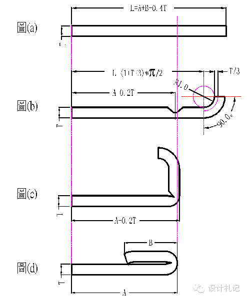 4.13側(cè)沖壓平 圖(a): 展開長度 L=A+B-0.4T 圖(b): 壓線位置尺寸 A-0.2T 圖(c): 90°折彎處尺寸為A+1.0T 圖(d): 側(cè)沖壓平后的產(chǎn)品形狀 |