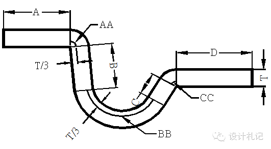 4.14 綜合計算如圖: L=料內(nèi)+料內(nèi)+補償量 =A+B+C+D +中性層弧長(AA+BB+CC) (中性層弧長均按 “中性層到板料內(nèi)側(cè)距離λ=T/3”來計算) |