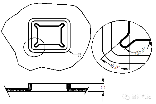 4.9 方形抽孔 方形抽孔,當(dāng)抽孔高度較高時(H>Hmax),直邊部展開與彎曲一致, 圓角處展開按保留抽高為H=Hmax的大小套彎曲公式展開,連接處用45度線及圓角均勻過渡, 當(dāng)抽孔高度不高時(H≦Hmax)直邊部展開與彎曲一致,圓角處展開保留與直邊一樣的偏移值. 以下Hmax取值原則供參考. 當(dāng)R≧4MM時: 材料厚度T=1.2~1.4取Hmax =4T 材料厚度T=0.8~1.0取Hmax =5T 材料厚度T=0.7~0.8取Hmax =6T 材料厚度T≦0.6取Hmax =8T 當(dāng)R<4MM時,請示上級. |