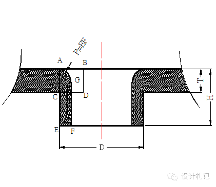 4.8 抽芽 抽芽孔尺寸計算原理為體積不變原理,即抽孔前后材料體積不變;ABCD四邊形面積=GFEA所圍成的面積. 一般抽孔高度不深取H=3P(P為螺紋距離),R=EF見圖 ∵ T*AB=(H -EF)*EF+π*(EF)2/4 ∴ AB={H*EF+(π/4-1)*EF2}/T ∴預(yù)沖孔孔徑=D – 2AB T≧0.8時,取EF=60%T. 在料厚T<0.8時,EF的取值請示上級. |
