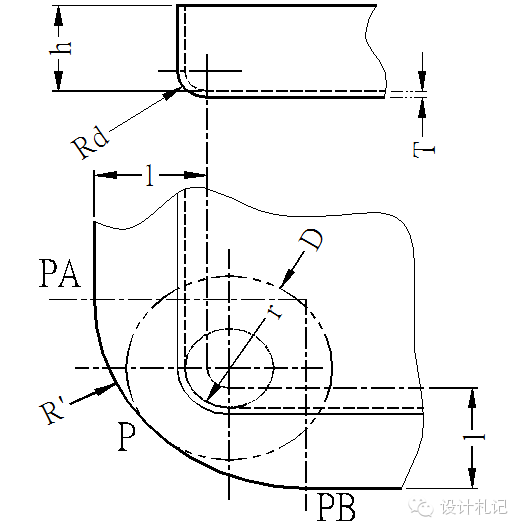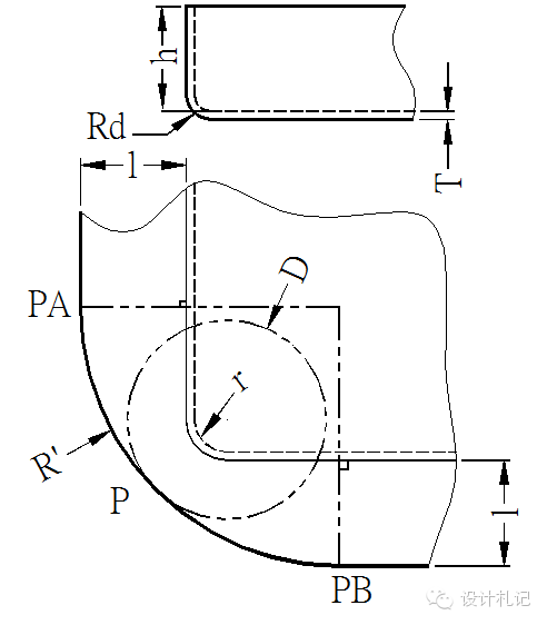 4.11壓縮抽形2 (Rd>1.5T) 原則:直邊部分按彎曲展開,圓角部分按拉伸展開,然后用三點切圓(PA-P-PB)的方式作一段與兩直邊和直徑為D的圓相切的圓弧. 當(dāng)Rd>1.5T時: l按相應(yīng)折彎公式計算. D/2={(r+T/3)2 +2(r+T/3)*(h+T/3) -0.86*(Rd-2T/3)*[(r+T/3) +0.16*(Rd-2T/3)]}1/2 |
