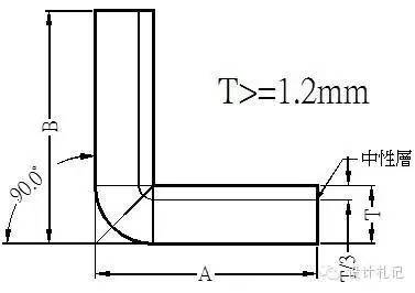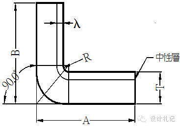 4.3 R≠0 θ=90° L=(A-T-R)+(B-T-R)+(R+λ)*π/2 當(dāng)R ≧5T時 λ=T/2 1T≦ R <5T λ=T/3 0 < R <T λ=T/4 (實際展開時除使用尺寸計算方法外,也可在確定中性層位置后,通過偏移再實際測量長度的方法.以下相同) |