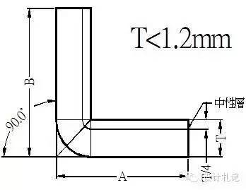 4.1 R=0,折彎角θ=90°(T<1.2,不含1.2mm) L=(A-T)+(B-T)+K =A+B-2T+0.4T 上式中取:λ=T/4 K=λ*π/2 =T/4*π/2 =0.4T |